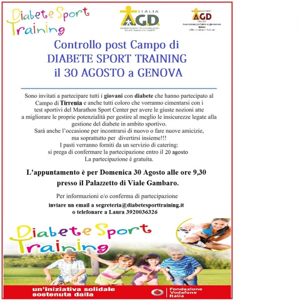 Sono invitati a partecipare tutti i giovani con diabete della Liguria che hanno partecipato al Campo di Tirrenia e anche tutti coloro che vorranno cimentarsi con i test sportivi del Marathon Sport Center per avere le giuste nozioni atte a migliorare le proprie potenzialità per gestire al meglio le insicurezze legate alla gestione del diabete in ambito sportivo.